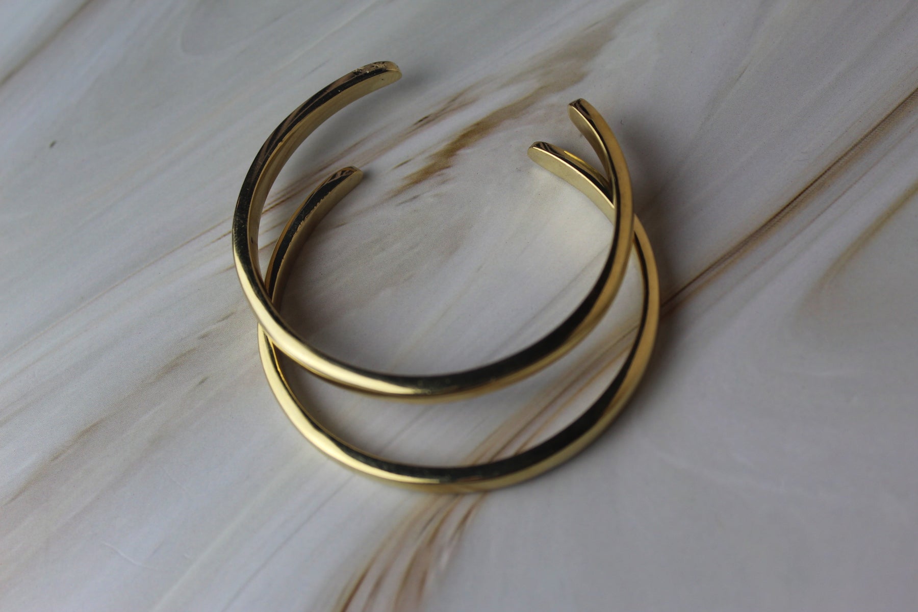This set of two Rebekah Cuffs is hand-cast from solid brass, making them durable and perfect for everyday wear. Simple and timeless, these cuffs will elevate any outfit. Made with high-quality materials, they offer both style and longevity. Upgrade your jewelry collection with these versatile and elegant cuffs.